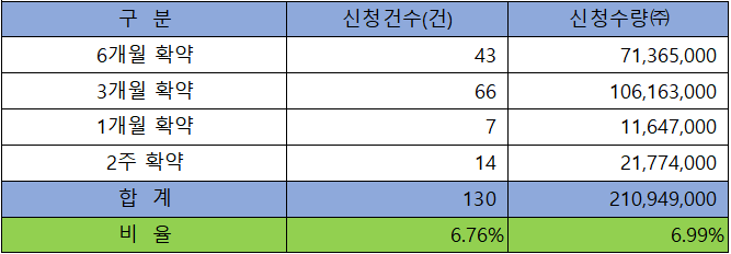 의무 보유 확약 건수는 130건에 210,949,000주로 전체 신청 물량 대비 건수로는6.76%, 수량으로는 6.99%였으며, 3개월 과 6개월 확약 비중이 높았습니다.
