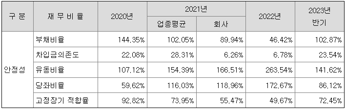 두산로보틱스의 부채비율은 모회사인 (주)두산과 재무적 투자자의 유상 증자를 통해 개선되어 업종 평균 대비 낮은 상태를 유지하고 있으며, 금번 공모를 통해 차입금 의존도 역시 더욱 개선될 것으로 전망하고 있습니다.