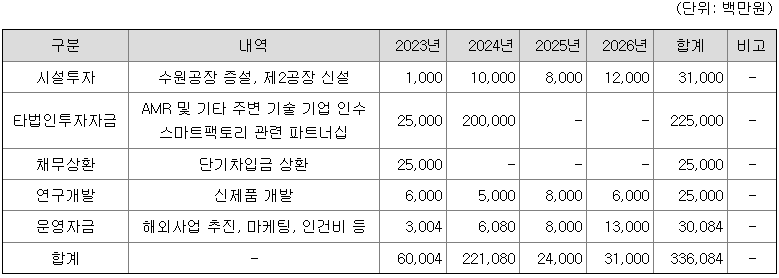 두산로보틱스는 금번 공모를 통해 조달된 자금으로 관련 회사의 인수 자금으로 2,250억을 사용할 계획이고, 공장 증설 등 시설 투자에 310억, 연구개발비에 250억, 차입금 상환에 250억을 사용한 후, 나머지 301억을 운영자금으로 사용할 계획입니다.