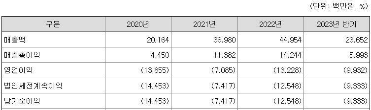 두산로보틱스는 2018년 양산 개시 이후 연평균 46%의 매출 성장세를 기록하고 있으며, 매출총이익 또한 증가하고 있지만, 아직 영업이익과 세전이익은 적자 상태입니다.
