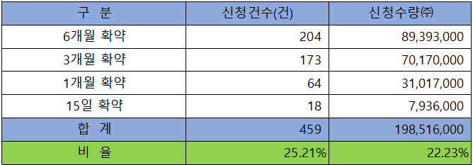 의무 보유 확약 건수는 459건에 198,516,000주로 전체 신청 물량 대비 건수로는 25.21%, 수량으로는 22.23%였으며, 6개월과 3개월 확약 비중이 높았습니다.