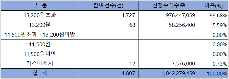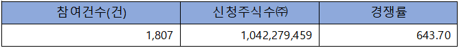 수요예측 참여 건수는 총 1,807건에 신청 주식수 1,042,279,459주로, 참여 경쟁률 643.70 : 1의 실적을 기록했습니다.