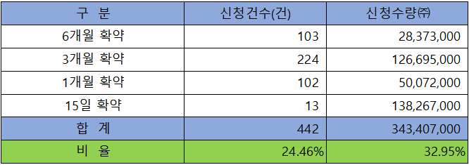 의무 보유 확약 건수는 442건에 343,407,000주로 전체 신청 물량 대비 건수로는 24.46%, 수량으로는 32.95%였으며, 1개월 이상 3개월과 6개월까지의 확약 비중이 고르게 나타났습니다.