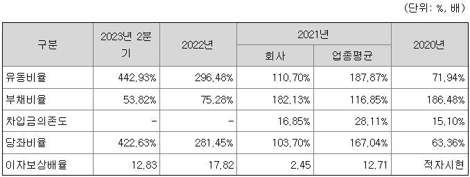 에스엘에스바이오는 업종 평균 대비 낮은 부채비율을 나타내고 있으며 2022년 이후 금융 기관 차입금이 제로 상태입니다.