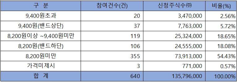 수요예측 참여 건수는 총 640건에 신청 주식수 135,796,000주로, 참여 경쟁률 235.14 : 1의 저조한 실적을 기록했습니다.