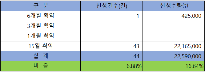 의무 보유 확약 건수는 44건에 22,590,000주로 전체 신청 물량 대비 건수로는 6.88%, 수량으로는 16.64%였으며, 특히 15일 확약 비율이 제일 높았습니다. 이 정도의 의무 보유 확약은 전체 공모에 큰 영향을 미치지 못한 것으로 생각됩니다.
