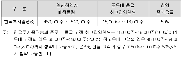한국투자증권의 일반 청약자 배정 물량은 450,000주 ~ 540,000주이고, 일반 청약자의 최고 청약 한도는 온라인 전용 고객 기준 7,500주 ~ 9,000주입니다.