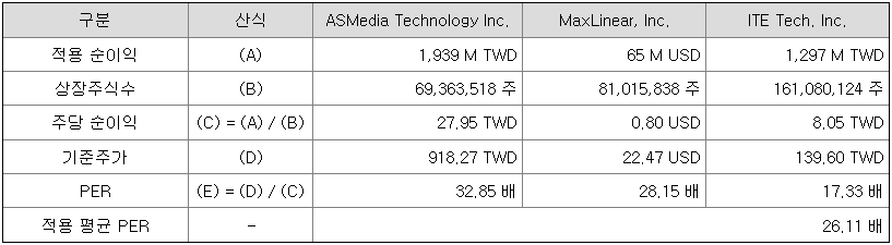 회사의 주당 평가가액은 2025년과 2026년의 순익익을 현재가치로 할인하여 환산환 후, 연간 평균치를 구하고 이를 주식 수로 나누어 주당 순이익을 구한 다음, 유사 회사의 평균 PER배수를 곱하여 산출한 것입니다.