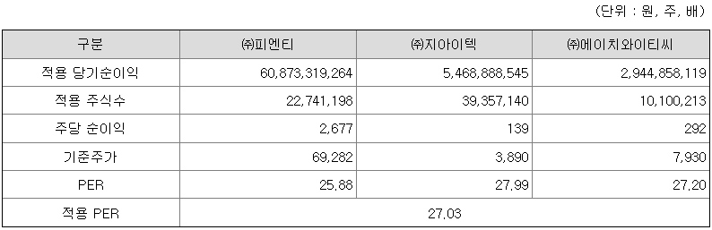 회사의 주당 평가가액은 2023년 3분기말 기준 직전 4개 분기 순이익에 유사회사의 평균 PER 배수를 곱하여 회사가치를 정하고, 이를 주식 수로 나누어 산출한 것입니다.