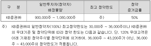 KB증권의 일반 청약자 배정 물량은 900,000주 ~ 1,080,000주이고, 일반 청약자의 최고 청약 한도는 일반 등급 기준 30,000주 ~ 36,000주입니다.