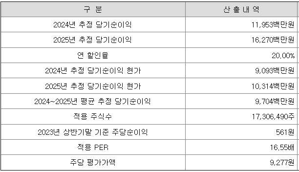 회사의 주당 평가가액은 2024년과 2025년의 추정 순이익을 현재가치로 할인하여 환산하여 연간 평균치를 구한 다음 주식 수로 나누어 주당 순이익을 구하고, 여기에 유사회사의 평균 PER배수를 곱하여 산출한 것입니다.