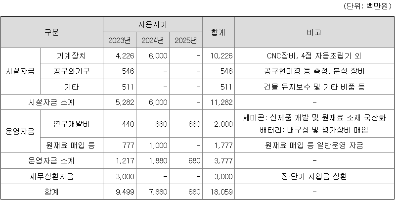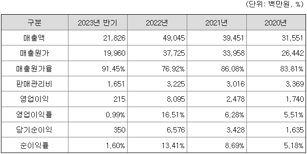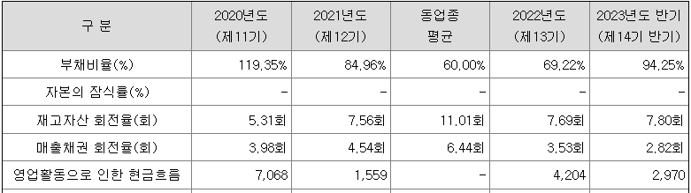 2023년에 신규 시설자금 투자를 위한 차입으로 부채비율이 상승하였으나, 금번 공모를 통한 자금으로 차입금 상환계획을 가지고 있어 개선될 전망입니다.
