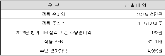 회사의 주당 평가가액은 2023년 반기 기준 직전 12개월의 순이익을 주식 수로 나누어 주당 순이익을 구하고, 여기에 유사회사의 평균 PER배수를 곱하여 산출한 것입니다.