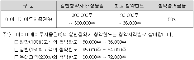 IBK투자증권의 일반 청약자 배정 물량은 300,000주 ~ 360,000주이고, 일반 청약자의 최고 청약 한도는 일반 고객 기준 30,000주 ~ 36,000주입니다.