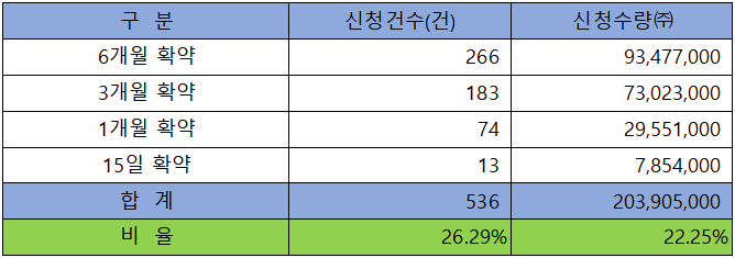의무 보유 확약 건수는 536건에 203,905,000주로 전체 신청 물량 대비 건수로는 26.29%, 수량으로는 22.25%였으며, 6개월과 3개월 의무 보유 확약 비중이 높아 의무 보유 확약 내용도 좋다고 평가할 수 있겠습니다.