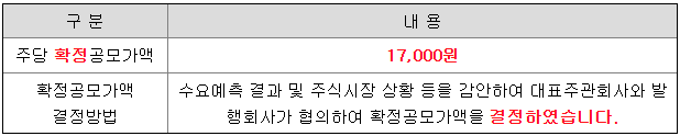 당초 희망 공모가격 (12,800원 ~ 14,500원) 상단 14,500원 대비 2,500원 상향 조정된 가격입니다.
