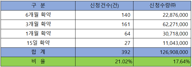 의무 보유 확약 건수는 392건에 126,908,000주로 전체 신청 물량 대비 건수로는 21.02%, 수량으로는 17.64%였으며, 3개월 확약 비중이 제일 높았고 그 뒤를 6개월 확약이 뒤따르고 있어 내용이 좋아 보입니다.