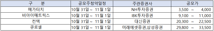 또한10월 30일과 11월 1일에 걸쳐 청약을 준비 중인 곳도 4곳에 달해서 이 부분까지 포함하면, 18곳이 청약을 준비 중입니다. 참고로 10월 30일과 11월 1일에 청약을 준비 중인 종목은 아래 표와 같습니다.