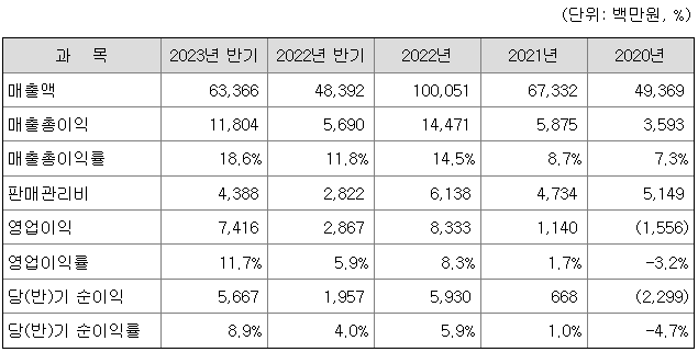 에스와이스틸텍은 영업이익률이 2021년 1.7%에서 2022년 8.3%, 2023년 반기 11.7%로 이익률이 개선되고 있습니다.