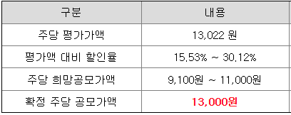하지만 수요예측 결과 공시 내용으로는 확정 공모가 13,000원 이상 신청 내용이 확인되지 않고 있습니다.