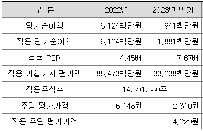 회사의 주당 평가가액은 2022년 순이이과 2023년 반기 순이익에 유사회사의 평균 PER배수를 곱하여 회사 가치를 정하고, 이를 주식 수로 나누어 산출한 것입니다.