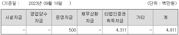 캡스톤파트너스는 금번 공모를 통해 조달된 자금으로 타 법인 증권 취득에 43억을 사용하고, 나머지 5억은 운영자금으로 사용할 계획입니다.