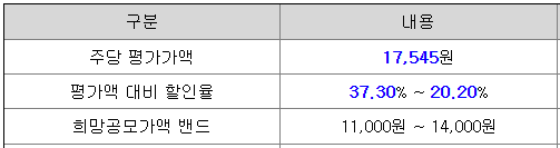 그린리소스의 희망 공모가격은 회사의 주당 평가가액 17,545원에서 20.20% ~ 37.30% 할인한 가격입니다.