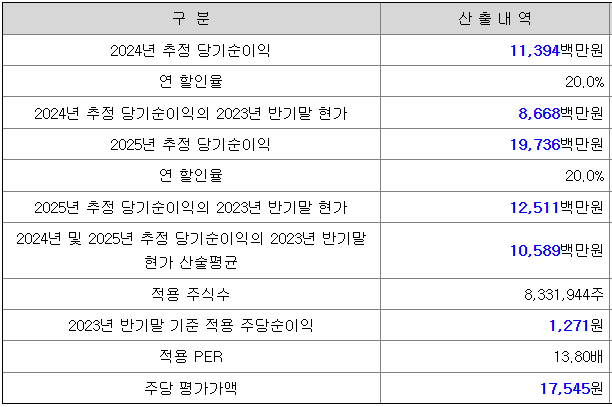 회사의 주당 평가가액은 2024년과 2025년의 추정 순이익을 할인하여 현재가치로 환산한 후, 주식 수로 나누어 주당 순이익을 구하고, 여기에 유사회사의 평균 PER 배수를 곱하여 산출한 것입니다.