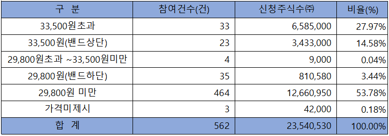 수요예측 참여 건수는 총 562건에 신청 주식수 23,540,000주로, 참여 경쟁률 20.88 : 1의 실적을 기록했습니다.