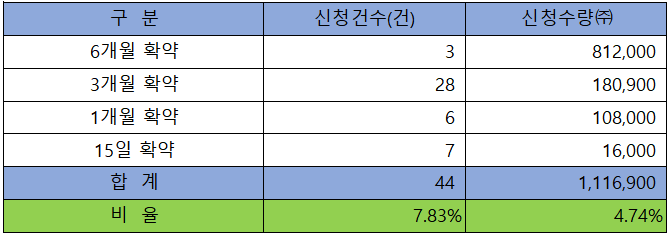 의무 보유 확약 건수는 44건에 1,116,900주로 전체 신청 물량 대비 건수로는 7.83%, 수량으로는 4.74%였으나, 수량이 미미해서 의미가 없는 수치입니다.