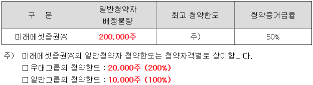 미래에셋증권과 삼성증권의 일반 청약자 배정 물량은 200,000주이고, 일반 청약자의 최고 청약 한도는 미래에셋증권 일반 고객 기준 10,000주, 삼성증권 온라인 전용 고객 기준 5,000주입니다.