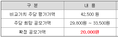 확정 공모가를 당초 희망 공모가 하단 29,800원보다 대폭 하향 20,000원으로 조정하였는데, 과연 일반 청약자들의 관심을 끌 수 있을지 모르겠습니다.