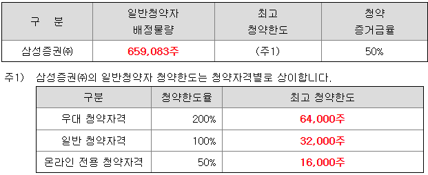 삼성증권의 일반 청약자 배정 물량은 659,083주이고, 일반 청약자의 최고 청약 한도는 온라인 전용 고객 기준 16,000주입니다. 청약 수수료는 온라인 기준 2,000원입니다.