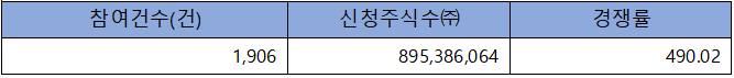 수요예측 참여 건수는 총 1,906건에 신청 주식수 895,386,064주로, 참여 경쟁률 490.02 : 1의 실적을 기록했습니다.