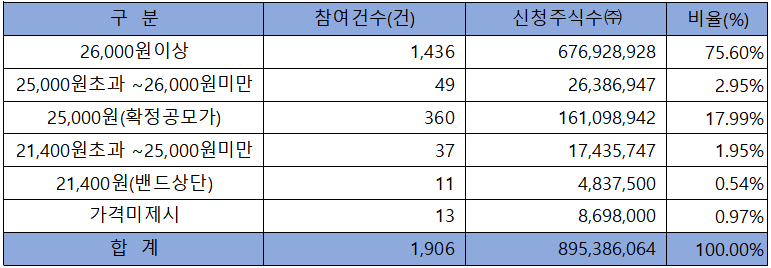 희망가격 상단 이상 신청 비율은 99.03%였으며, 확정 공모가 25,000원 이상 신청 비율도 96.54%에 달했습니다.