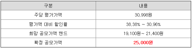 당초 희망 공모가격 상단 21,400원 대비 3,600원 상향 조정된 가격입니다.