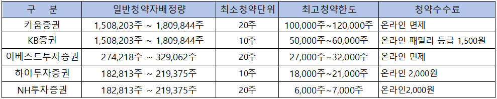 - 청약 가능 증권사 : 키움증권, KB증권, 이베스트투자증권, 하이투자증권, NH투자증권