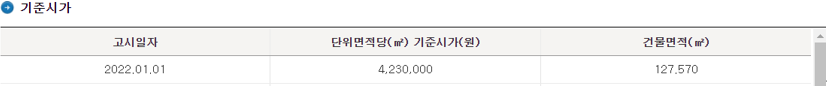 기준시가 전체 금액을 구하기 위해서는 단위면적당 기준시가에 건물면적으로 곱하면 되는데, 아래 기준 시가 기준으로 전체 금액은 4,230,000원 × 127.570헤베 = 539,621,100원이 됩니다.
