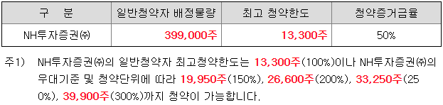 NH투자증권의 일반 청약자 배정 물량은 399,000주이고, 일반 청약자의 최고 청약 한도는 일반 고객 기준 13,300주입니다.