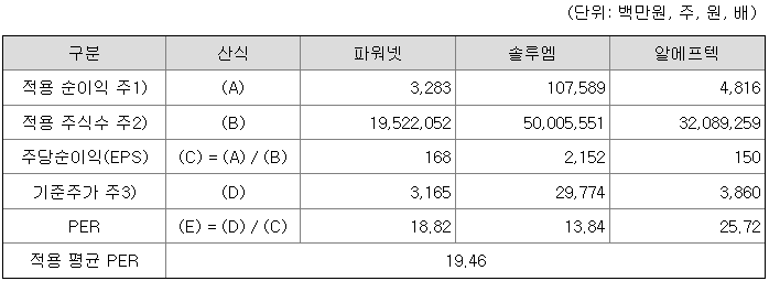 회사의 주당 평가가액은 2025년 7월부터 2026년 6월까지 추정 순이익을 할인하여 현재 가치롤 환산한 후 주식 수로 나누어 주당 순이익을 구하고, 여기에 유사회사의 평균 PER배수를 곱하여 산정한 것입니다.