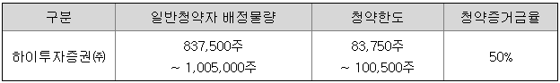 하이투자증권의 일반 청약자 배정 물량은 837,500주 ~ 1,005,000주이고, 일반 청약자의 최고 청약 한도는 모든 고객 공히 83,750주 ~ 100,500주입니다.