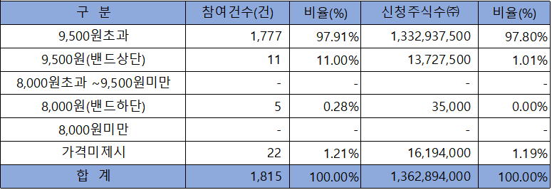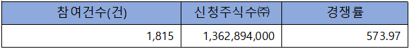 수요예측 참여 건수는 총 1,815건에 신청 주식수 1,362,894,000주로, 참여 경쟁률 573.97 : 1의 실적을 기록했습니다.