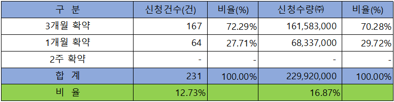 의무 보유 확약 건수는 231건에 229,920,000주로 전체 신청 물량 대비 건수로는 12.73%, 수량으로는 16.87 %였으며, 3개월 확약 비중이 제일 높았습니다.