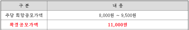 당초 희망 가격 상단 9,500원 대비 1,500원 상향 조정된 가격입니다.