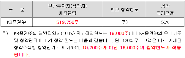KB증권의 일반 청약자 배정 물량은 519,750주이고, 일반 청약자의 최고 청약 한도는 일반 고객 기준 16,000주입니다.