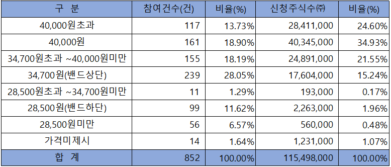 제시가격을 자세하게 공시하면서 희망 공모가 상단을 그대로 공모가로 확정한 이유를 설명하는 듯한데, 희망 공모가격 상단 이상 신청 비율은 수량 기준 96.32%였고, 희망 공모가 하단 이하 신청 비율은 수량 기준 2.44%였습니다.