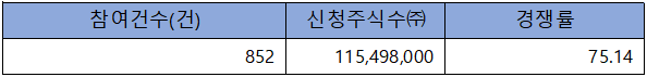 수요예측 참여 건수는 총 852건에 신청 주식수 115,498,000주로, 참여 경쟁률 75.14 : 1의 실적을 기록했습니다.