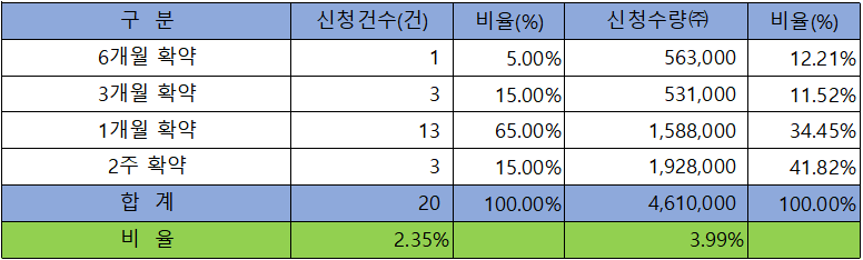 의무 보유 확약 건수는 20건에 4,610,000주로 전체 신청 물량 대비 건수로는 2.35%, 수량으로는 3.99였으며, 1개월 확약 비중이 제일 높았습니다.