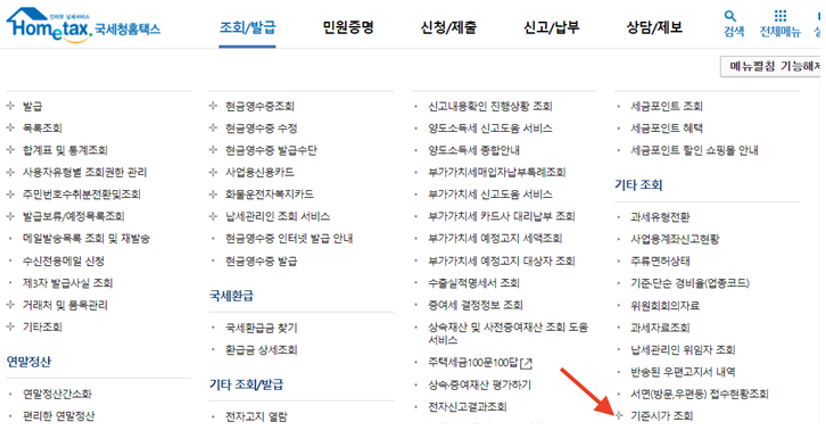 국세청 홈텍스 로그인 후 조회/발급 선택 후 기준시가 조회 → 상업용 건물/ 오피스텔의 순서로 선택하면 오피스텔 주소를 입력하는 화면이 나옵니다.