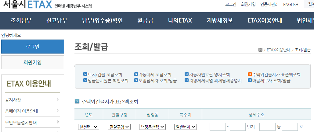 시가표준액을 조회하는 방법은 조금 더 복잡합니다.